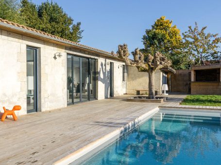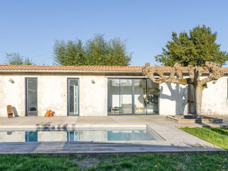 Le travail en façade est réalisé de façon à uniformiser les ouvertures en hauteur. Les linteaux sont alignés tandis que les allèges de fenêtre sont supprimées pour transformer ces dernières en porte-fenêtre. Une large baie à galandage est créée dans le séjour permettant de l’ouvrir en grand sur le jardin. Cette baie à galandage rentre dans le mur et permet au salon de s’ouvrir totalement sur l’extérieur.