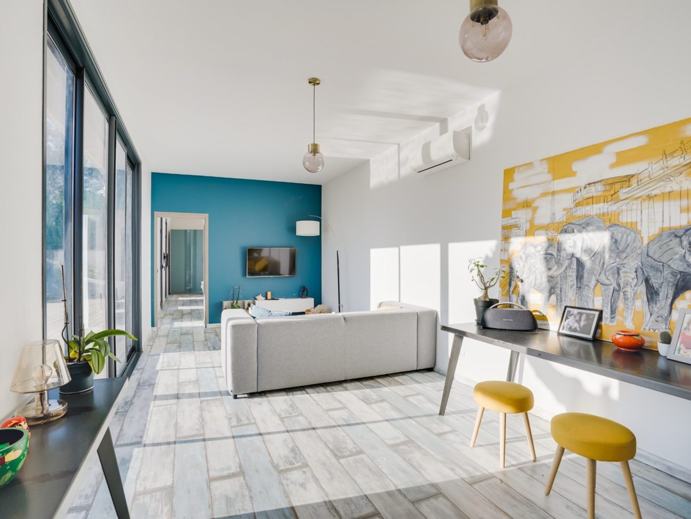 Nous avons tiré parti de la forme allongée et étroite de la maison pour disposer la suite parentale et l’ensemble « nuit enfants » de part et d’autre du séjour. Cette disposition en enfilade permet d’éviter les circulations dans les parties les plus étroites de la maison. En plus, cette disposition offre à chaque pièce de vie et une ouverture sur la seule façade du bâtiment ouverte sur le jardin et la piscine.