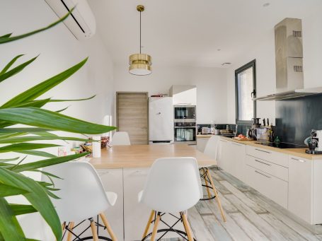 Enfin, l’aménagement intérieur reprend la forme longiligne de l’existant ce qui permet de gagner en m². La cuisine bénéficie d’un long plan de travail et d’un îlot avec et placards intégrés pour maximiser les rangements. Enfin, le choix des matériaux intérieurs murs et plafonds blancs, sol parquet de teinte clair. Ce qui permet d’augmenter la luminosité dans les pièces de vies. La rénovation de cette maison en pierre permet d'avoir des espaces personnalisés et agréables pour ces occupants.
