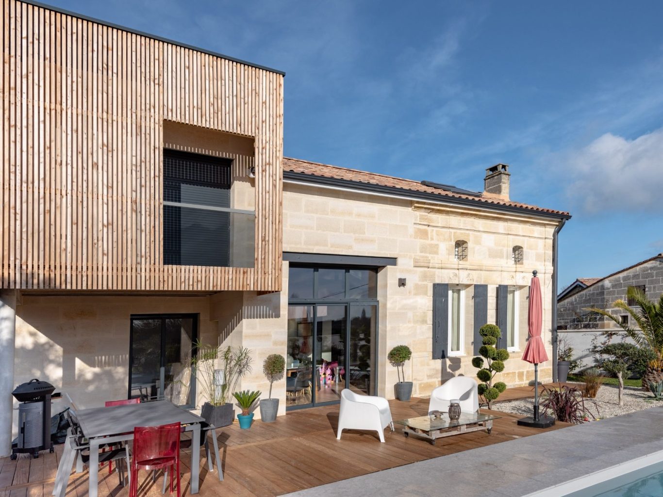 Cette structuration est soulignée par l'usage de deux matières : de la pierre au rez-de-chaussée en rappel de la maison existante, du bois en bardage ajouré vertical, à l'étage utilisant.