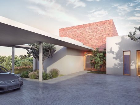 Les volumes de cette architecture simple et épurée sont soulignés par l’alternance de deux matières naturelles en façade : la chaux grasse et la brique. Cette dernière est mise en œuvre en habillage simple du volume de la partie jour, ou en appareillage ajouré, pour former le claustra qui referme les différents patios. Ces deux matériaux associés au bois d’aspect naturel des menuiseries confèrent une touche chaleureuse et rustique à cette maison neuve.