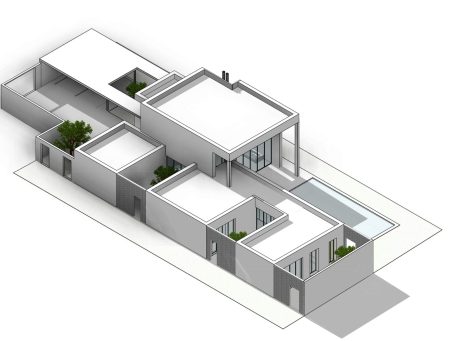 Sur un terrain situé en seconde ligne dans un quartier pavillonnaire de Lormont près de Bordeaux, cette maison neuve à patios est conçue pour répondre à deux attentes de ses propriétaires. La première est de s’isoler des vis-à-vis avec le voisinage côté nord. La seconde est de s’ouvrir largement sur le jardin. Pour résoudre cette équation, le plan de la maison est disposé en « L » avec une partie nuit côté long et une partie jour côté court.